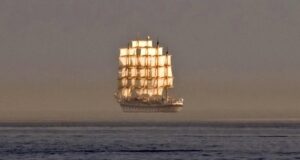 Άλλα 50 χρόνια πιο πίσω, και ο μικρός Πέτρος που θα γινόταν αργότερα ο πατέρας του Θωμά αλλά τότε ήταν ακόμα ένα οκτάχρονο αγόρι, στεκόταν στο ίδιο μπαλκόνι και ρέμβαζε την ανατολή του ηλίου, όταν ξαφνικά εμφανίστηκε στο στερέωμα το πλοίο φάντασμα να πλέει πλησίστιο με κατεύθυνση το φλογισμένο αστέρι. Μια κραυγή τρόμου ξέφυγε από τα χείλη του αγοριού και η γιαγιά του που το ανέτρεφε γιατί ήταν ορφανό, έτρεξε αμέσως κοντά του, το τύλιξε στα μαύρα της φουστάνια και του έκλεισε τα μάτια με τις αργασμένες παλάμες της. Μην κοιτάζεις γιόκα μου, μην κοιτάς, όποιος βλέπει την μάγισσα, εκείνη τον μαγεύει και τον κάνει δικό της, σκλάβο της. Η γριά σταυροκοπήθηκε και το δαιμονικό όραμα διαλύθηκε· μεγαλύτερη από την δύναμη της μάγισσας είναι του Σταυρού η Χάρη. Ο θαλασσόλυκος παππούς όμως γέλασε με την τρομάρα του παιδιού και σαν νύχτωσε το πήρε παράμερα δίπλα στην πυροστιά, άναψε το τσιμπούκι του και άρχισε να του διηγείται ιστορίες για τον Ιπτάμενο Ολλανδό που περιπλανιέται αιώνια στα κύματα μέχρι να λυθεί η κατάρα και για το κάστρο της Μorgana που ξεπρόβαλε στον ουρανό ανάμεσα στα σύννεφα. Και ο μικρός καθόταν και τον άκουγε με ανοιχτό το στόμα, έντρομος μαζί και μαγεμένος, τρόμος και μαγεία μεγέθη ευθέως ανάλογα που την συνισταμένη τους αποκαλούμε ιερόν δέος.